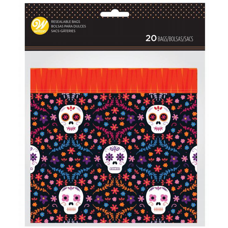 Foliowe torebki do pakowania słodkości oraz drobnych upominków z nadrukiem kolorowych czaszek.