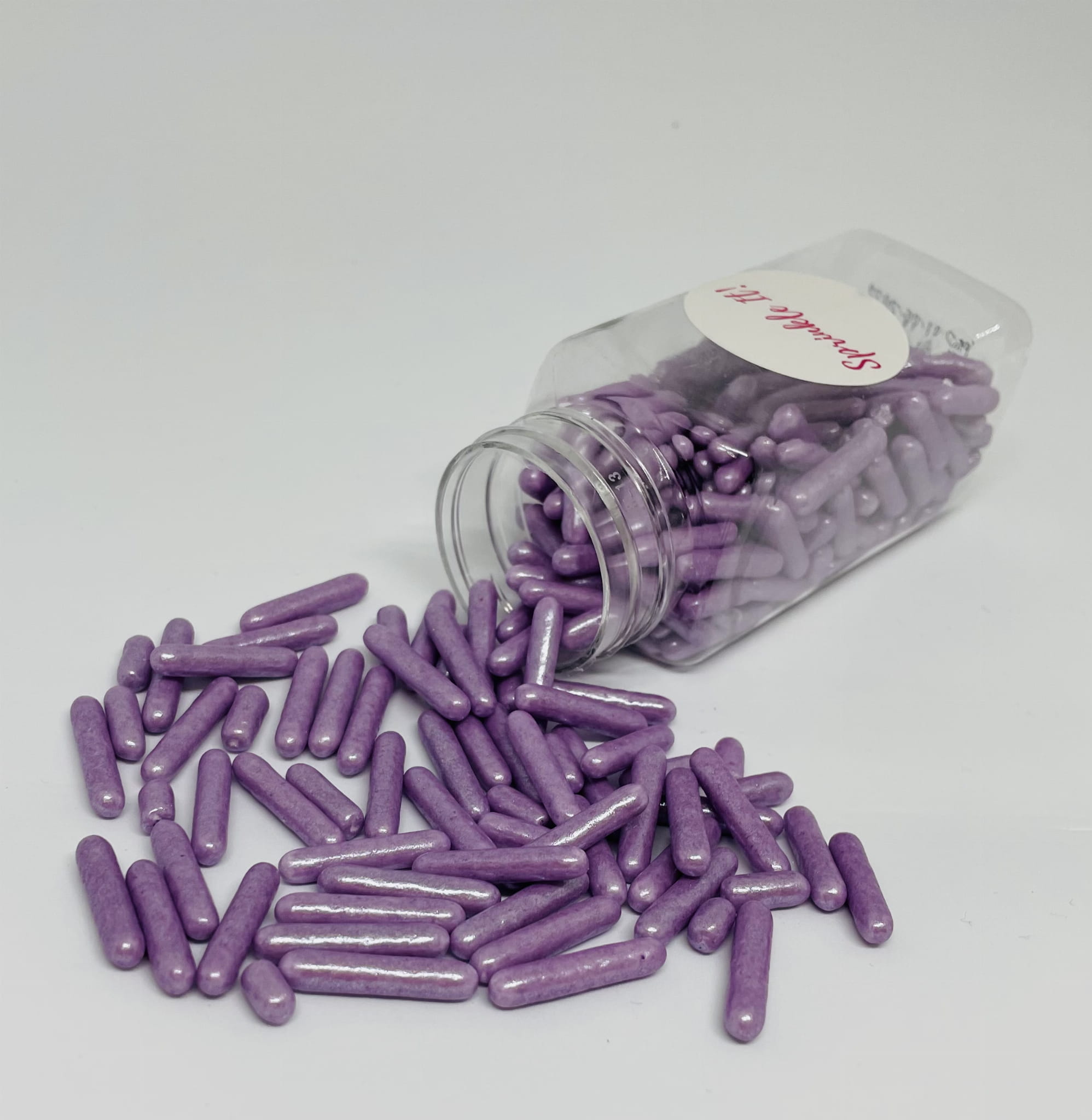 Posypka do ciast, ciasteczek i deserów w kształcie podłużnych makaroników w fioletowym kolorze.