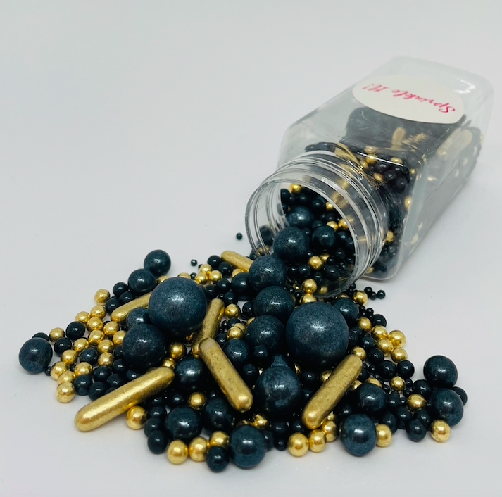 Posypka do ciast, ciasteczek i deserów w różnych kształtach i fakturach w czarnym i złotym kolorze.