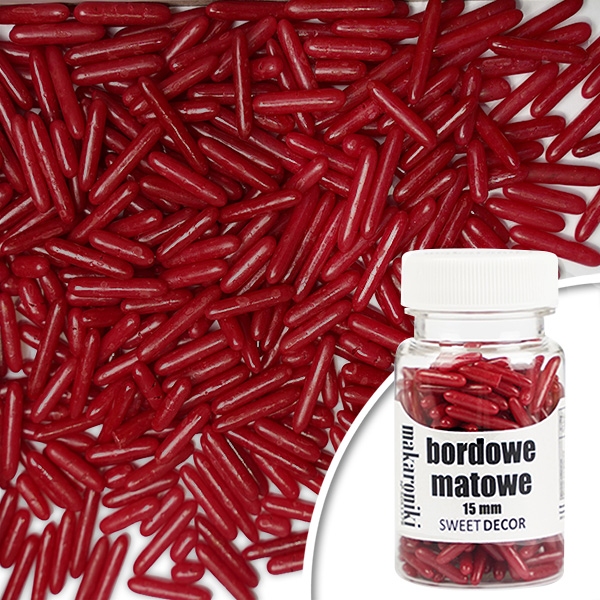 Makaroniki cukrowe stanowią wiodący element wystroju deserów, urocze, słodkie, przyciągają wzrok. Posypka cukrowa w kształcie podłużnych bordowych makaroników sprawi, że Twój deser będzie w centrum zainteresowania.