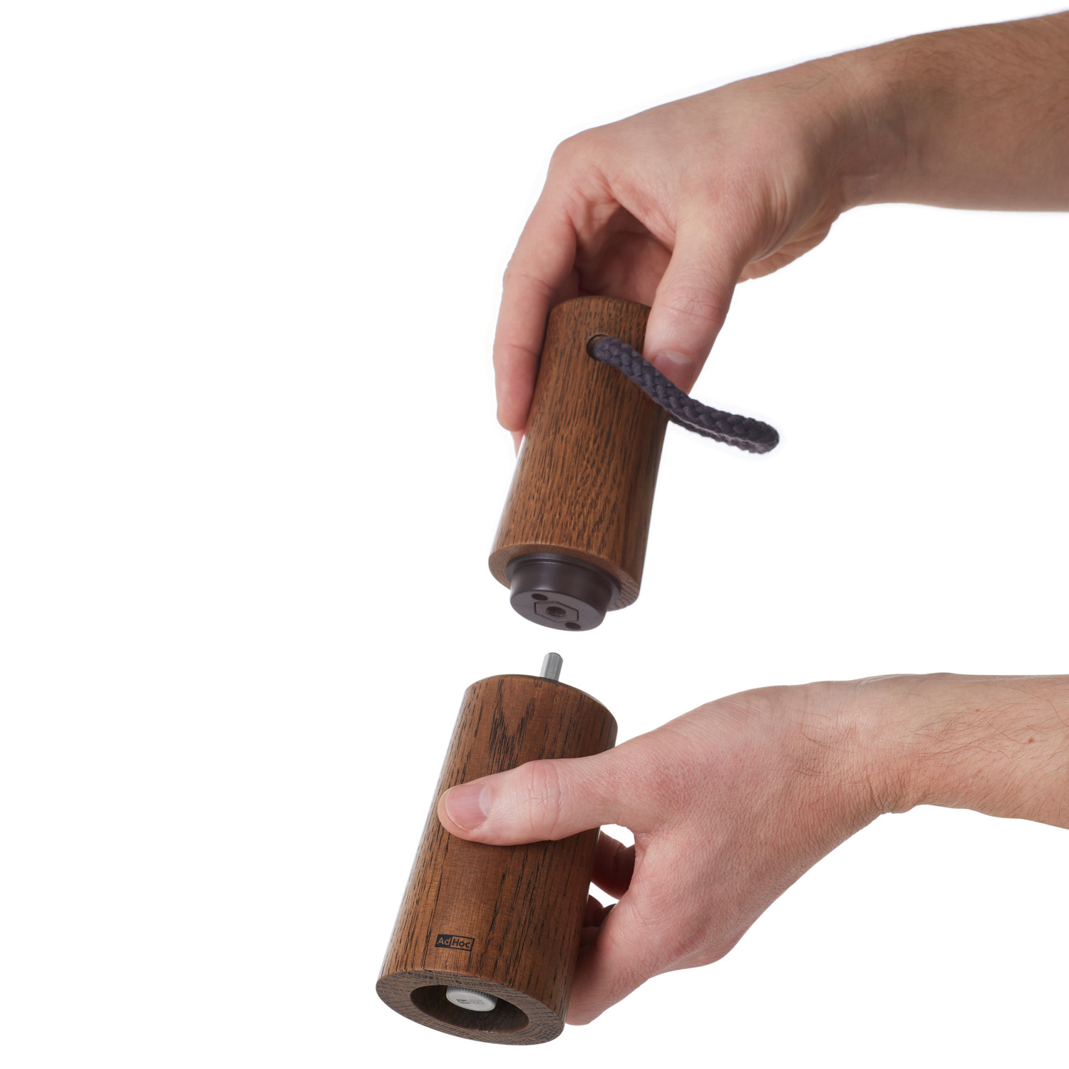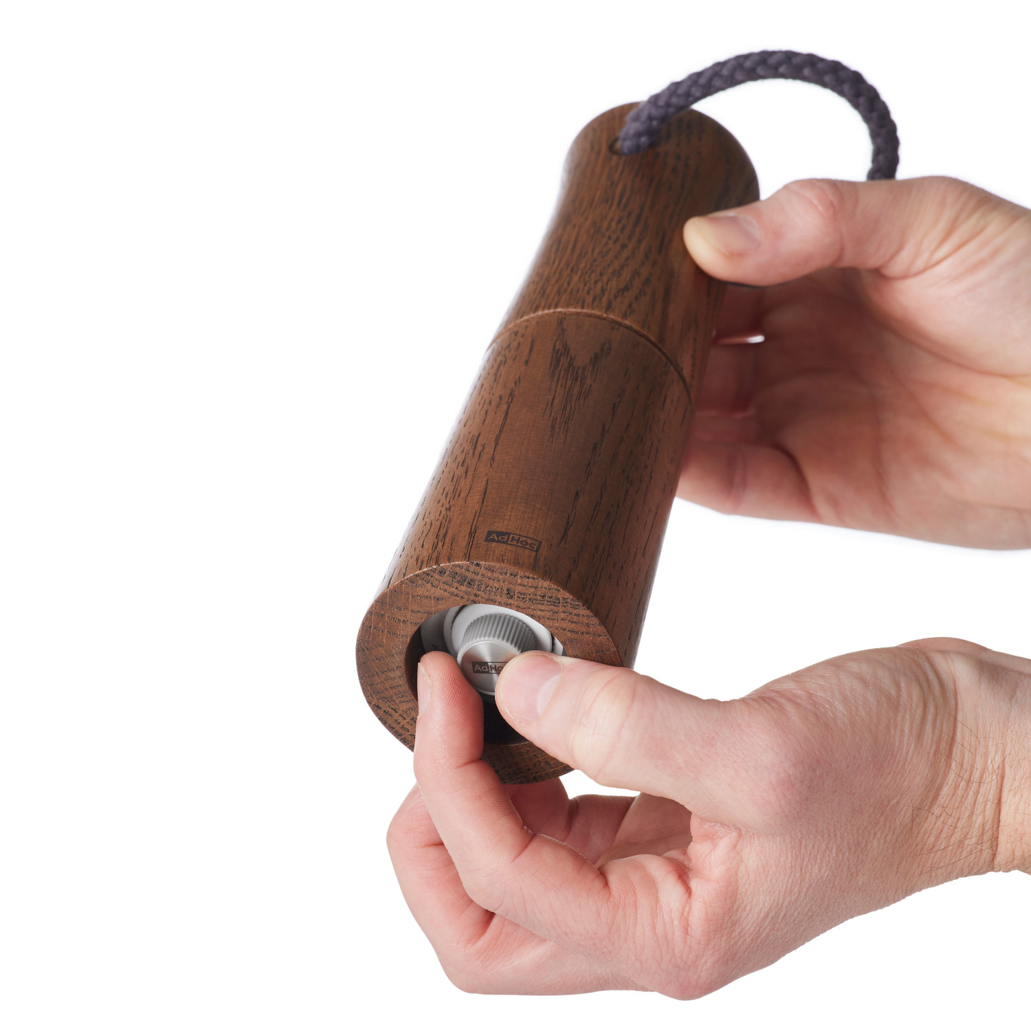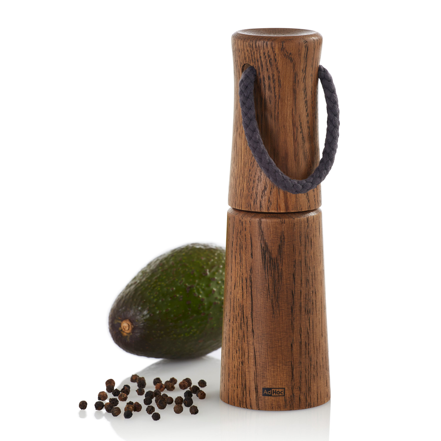 Młynek do soli lub pieprzu z ciemnego olejowanego drewna dębowego. Profilowana obudowa o zaokrąglonych krawędziach przyjemnie leży w dłoni. Bawełniany sznurek zamocowany w pokrywie młynka ułatwia przenoszenie.