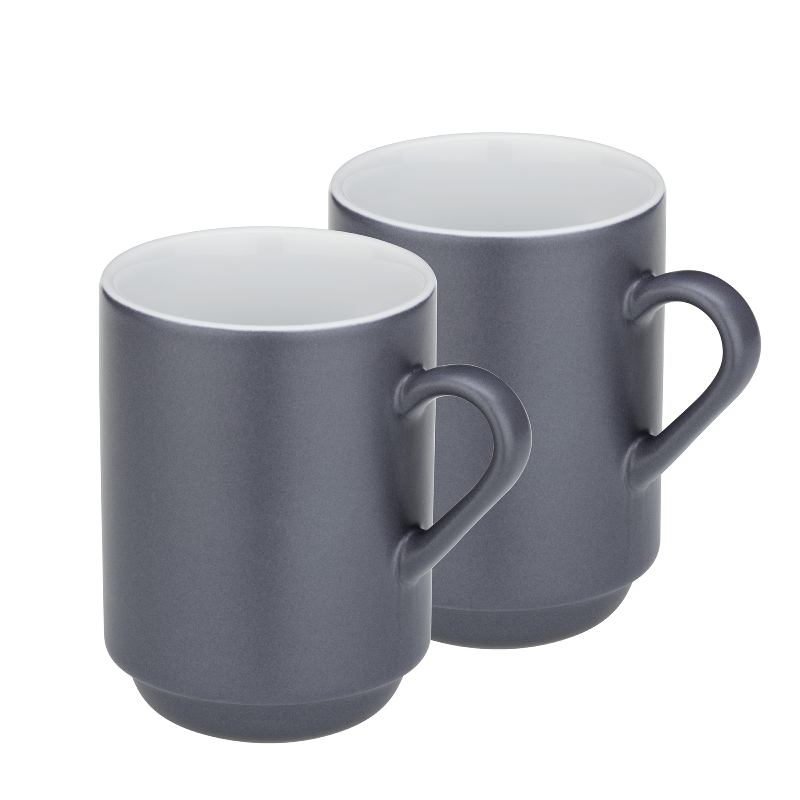 Kubki charakteryzują się nowoczesnym kształtem. Wykończone są w dwóch kolorach: wewnątrz w białym, na zewnątrz szarym.