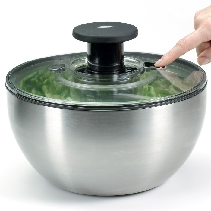 Wirówka składa się z wewnętrznego kosza z tworzywa sztucznego, którego można używać jako durszlaka i z stalowej miski, która się świetnie nadaje się do serwowania sałaty.