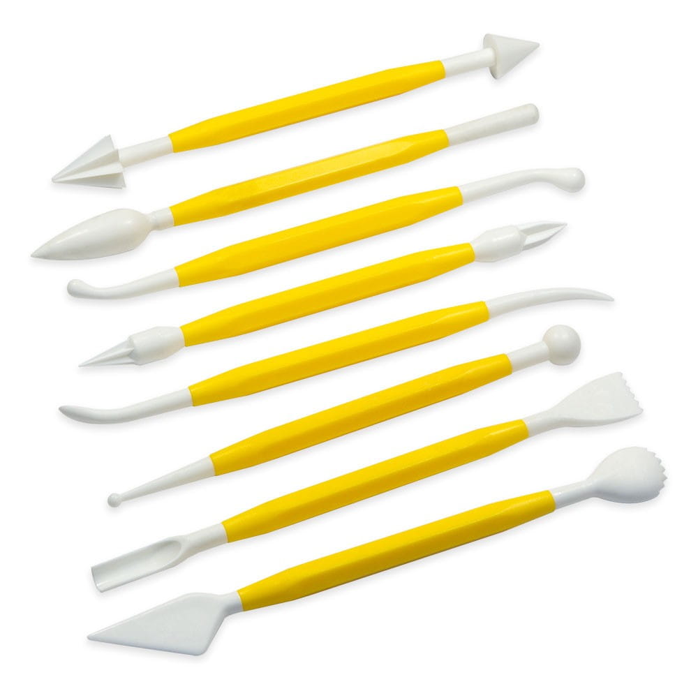 W skład kompletu wchodzi 8 sztuk narzędzi z 16 różnymi końcówkami: zakrzywione kulki, muszelka i nożyk, grzebyk, półokrągłe ostrze, narzędzie kulkowe, trzy różne stożki i łezki (gładkie i gwiazdki), narzędzie do płatków i listków (tzw. drezdeńskie).