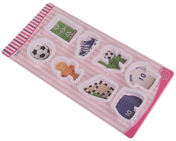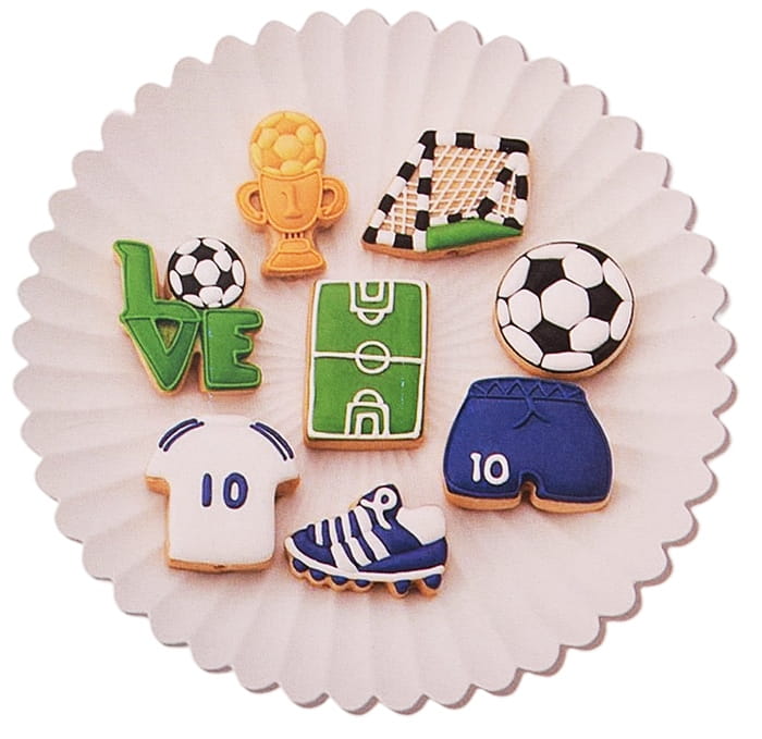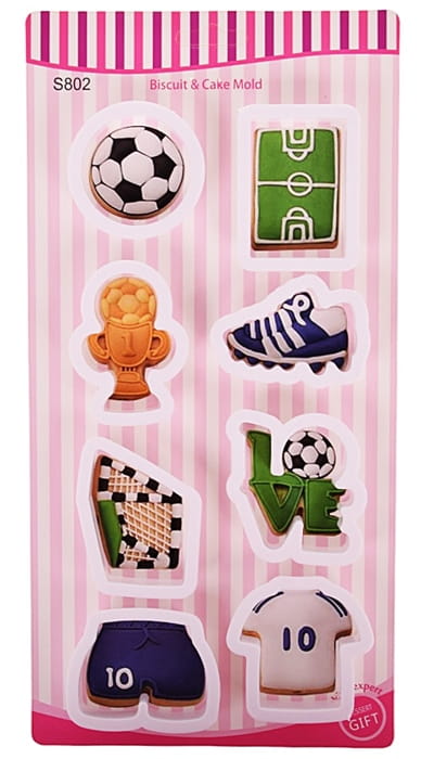 Zestaw wykrawaczy Piłka nożna to idealny produkt dla wszystkich miłośników futbolu oraz kulinarnych przygód. Składający się z 8 sztuk wykrawaczy, pozwala na tworzenie pierników, ciasteczek oraz ozdób z masy cukrowej o tematyce piłkarskiej: piłka, boisko, puchar, but piłkarski, bramka, spodenki i koszulka piłkarska, napis love z piłką.