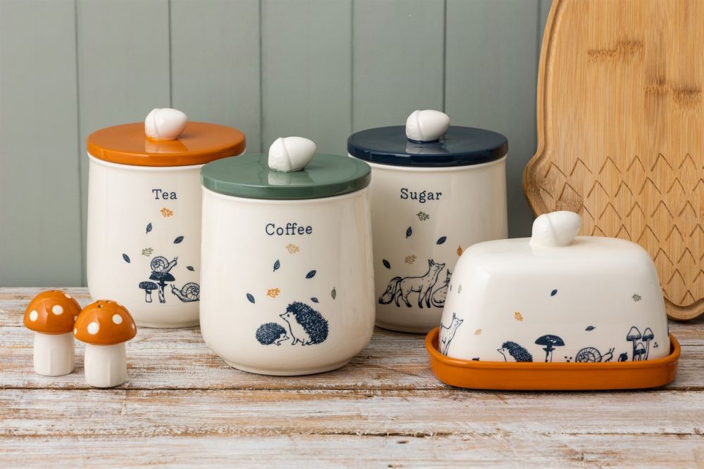 Pojemnik na cukier wykonany z wysokiej jakości ceramiki. Jego ścianki zdobią rysunki leśnych zwierząt. Uroku całości dodaje uchwyt pokrywki w kształcie żołędzia.