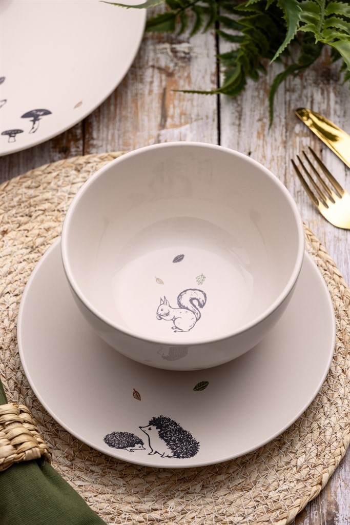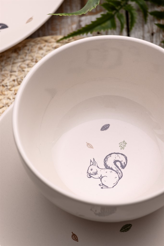 Miska wykonana z wysokiej jakości ceramiki, doskonała do serwowania owsianki, płatków z jogurtem lub przekąski. Jej dno zdobi rysunek wiewiórki oraz jesiennych liści.