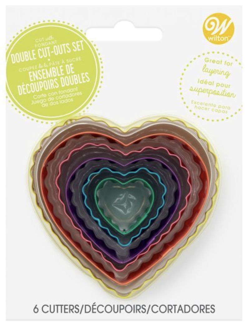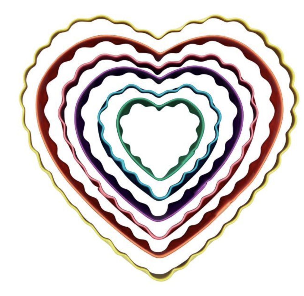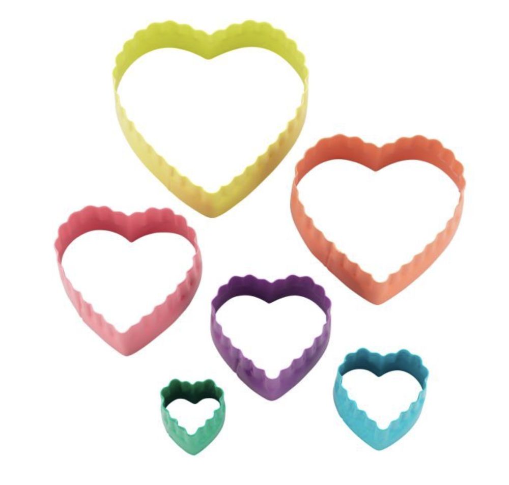 Komplet sześciu metalowych foremek do wykrawania ciastek, pierników czy dekoracji z fondantu w kształcie serc w różnych wielkościach (2,2 cm, 3,3 cm, 4,3 cm, 5,2 cm, 6,4 cm, 7,6 cm). Foremki są dwustronne - wykrawają kształty o brzegach gładkich i pofalowanych. Dla szybkiej identyfikacji każda z foremek ma inny kolor.