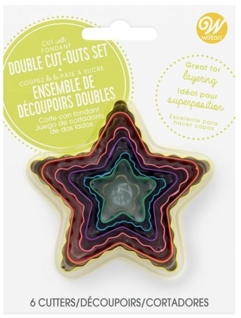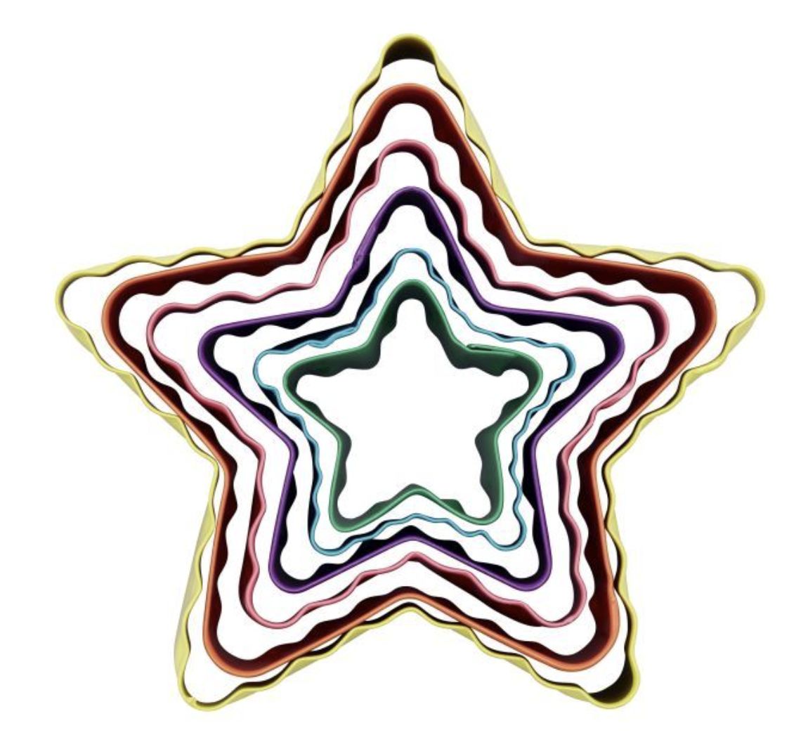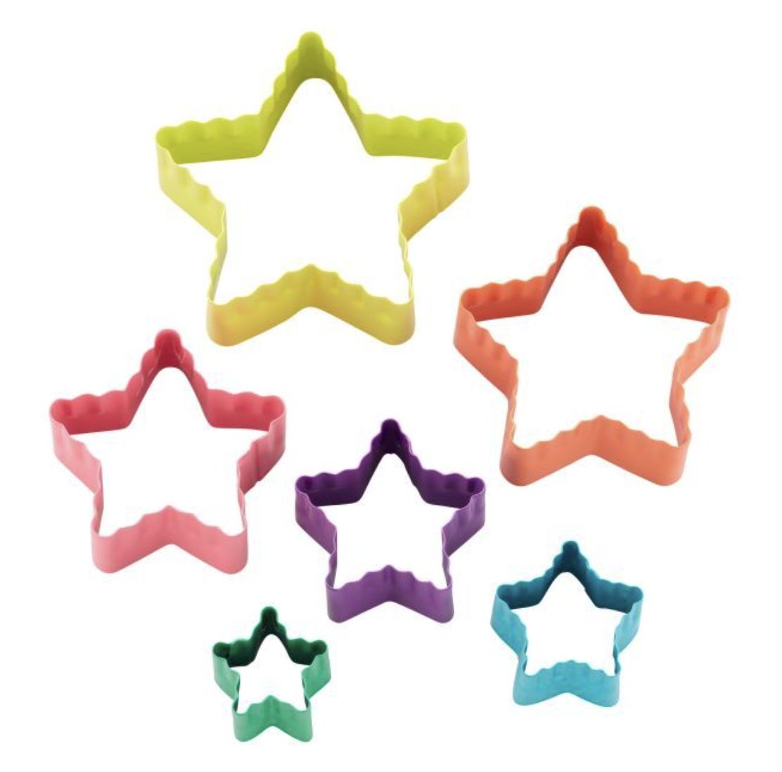 Komplet sześciu metalowych foremek do wykrawania ciastek, pierników czy dekoracji z fondantu w kształcie gwiazd w różnych wielkościach (2,4 cm, 3,2 cm, 4,1 cm, 5 cm, 6 cm, 7,3 cm). Foremki są dwustronne - wykrawają kształty o brzegach gładkich i pofalowanych. Dla szybkiej identyfikacji każda z foremek ma inny kolor.