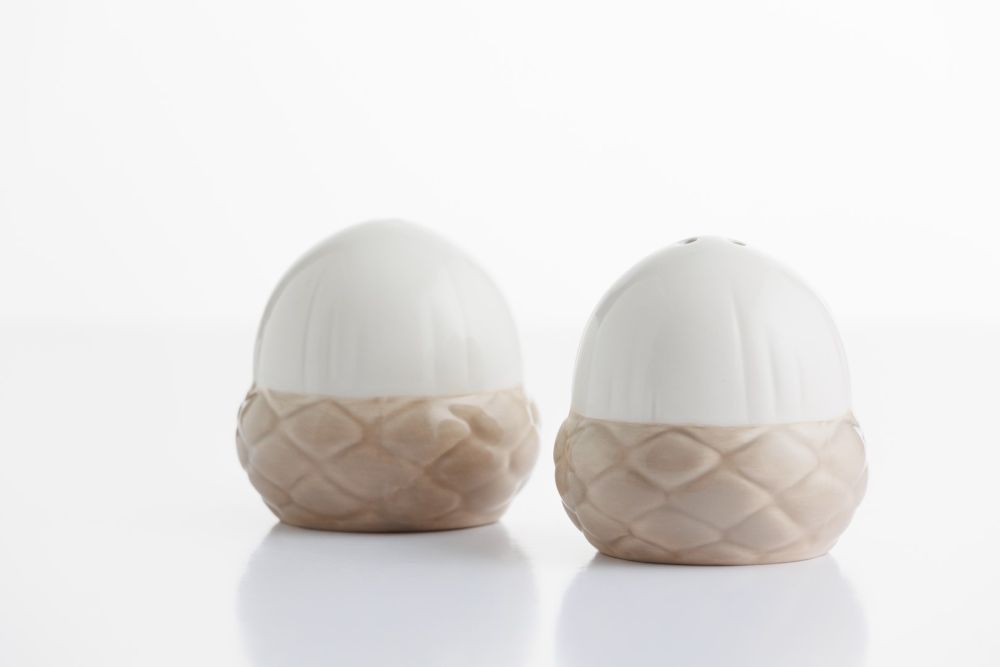 Ceramiczny zestaw do soli i pieprzu, formą nawiązujący do kształtu żołędzi. Dolna część przyprawników jest ręcznie malowana. Jak wszystkie naczynia z serii Acorn ich kolorystyka utrzymana jest w jasnych naturalnych barwach.