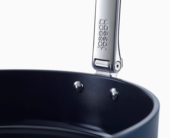 Ogromną zaletą patelni jest jej składany stalowy uchwyt, dzięki czemu zajmuje ona o połowę mniej miejsca w szafce czy szufladzie. Stabilność uchwytu po złożeniu zapewnia testowane przez 20 lat mocowanie SwingLock. Patelnia zaopatrzona jest też w dodatkowy uchwyt z przodu.