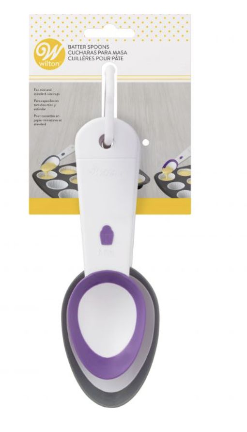 Komplet dwóch łyżek, o dwóch różnych pojemnościach, ułatwiających napełnianie foremek na babeczki i muffinki zawsze dokładnie taką samą ilością ciasta. Dzięki temu babeczki będą identycznej wielkości i równomiernie upieczone.