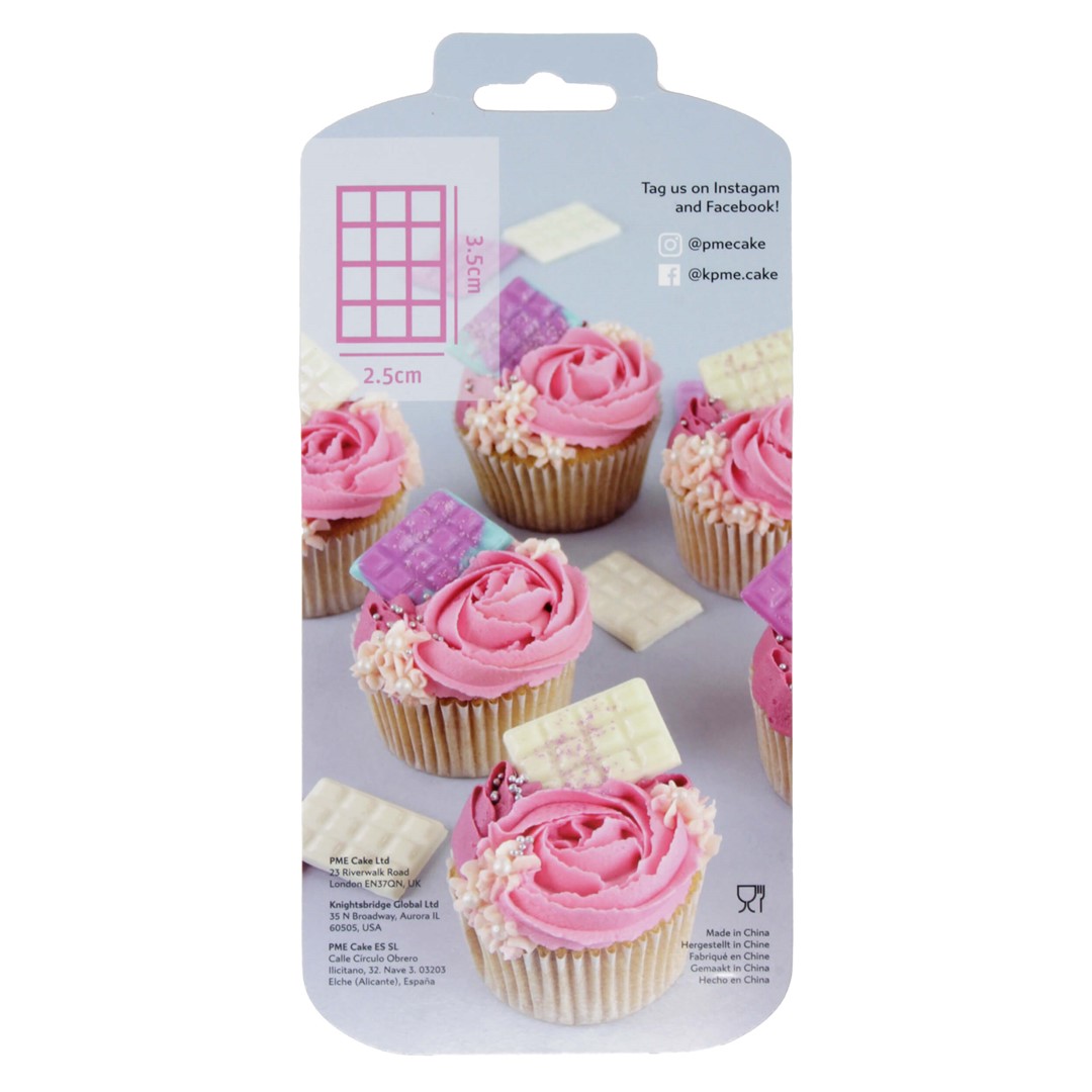 Forma z tworzywa sztucznego na 12 mini tabliczek czekolady (każdej o wymiarach 3,5 cm x 2,5 cm). Takie malutkie czekoladki, o precyzyjnie odwzorowanym kształcie, to doskonały sposób na urozmaicenie dekoracji babeczek czy tortów.
