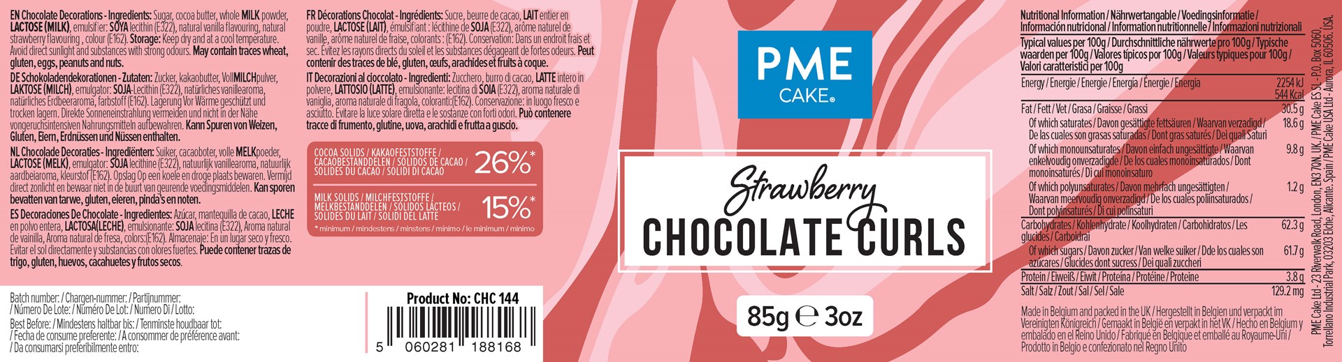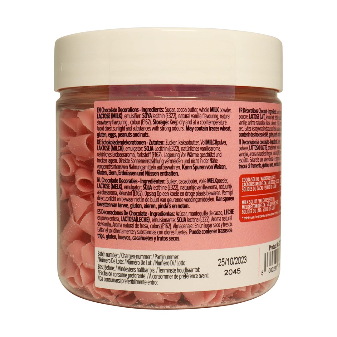 Czekoladowe wiórki o smaku truskawki, wykonane z najwyższej jakości belgijskiej czekolady. Idealnie komponują się z babeczkami, deserami i innymi wypiekami, nadając im unikalny charakter. Urozmaicą lody oraz gorące napoje, takie jak caffe latte czy gorąca czekolada.