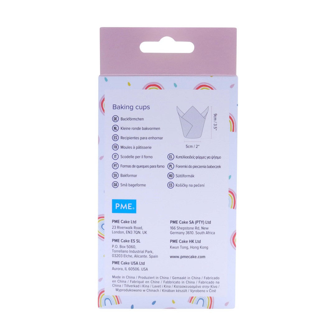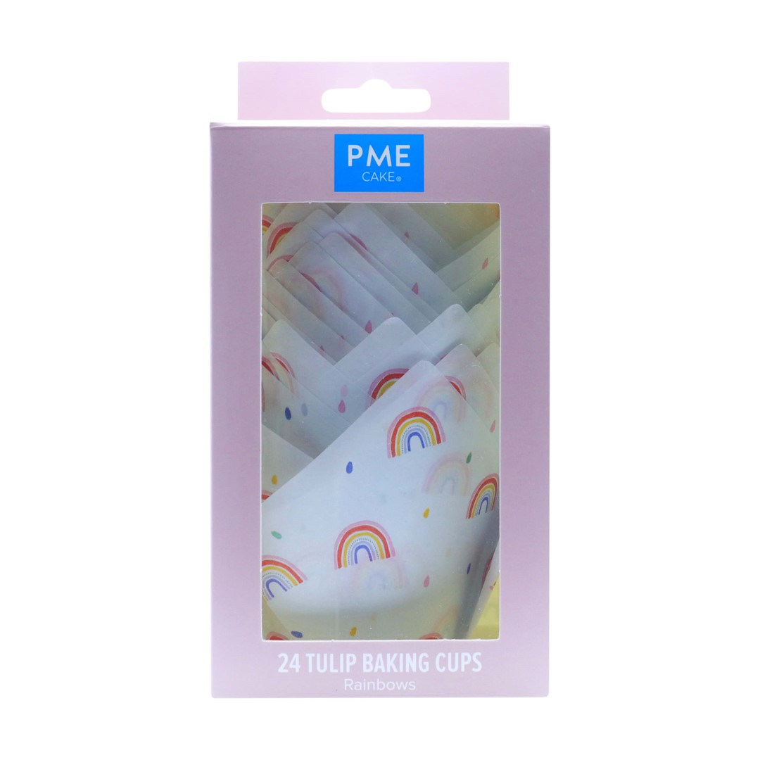 Eleganckie papilotki do babeczek i muffinów, w tzw. kształcie tulipana, z motywem tęczy na białym tle.