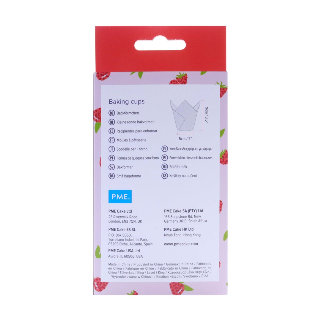 Eleganckie papilotki do babeczek i muffinów, w tzw. kształcie tulipana, z wzorem malin na białym tle.
