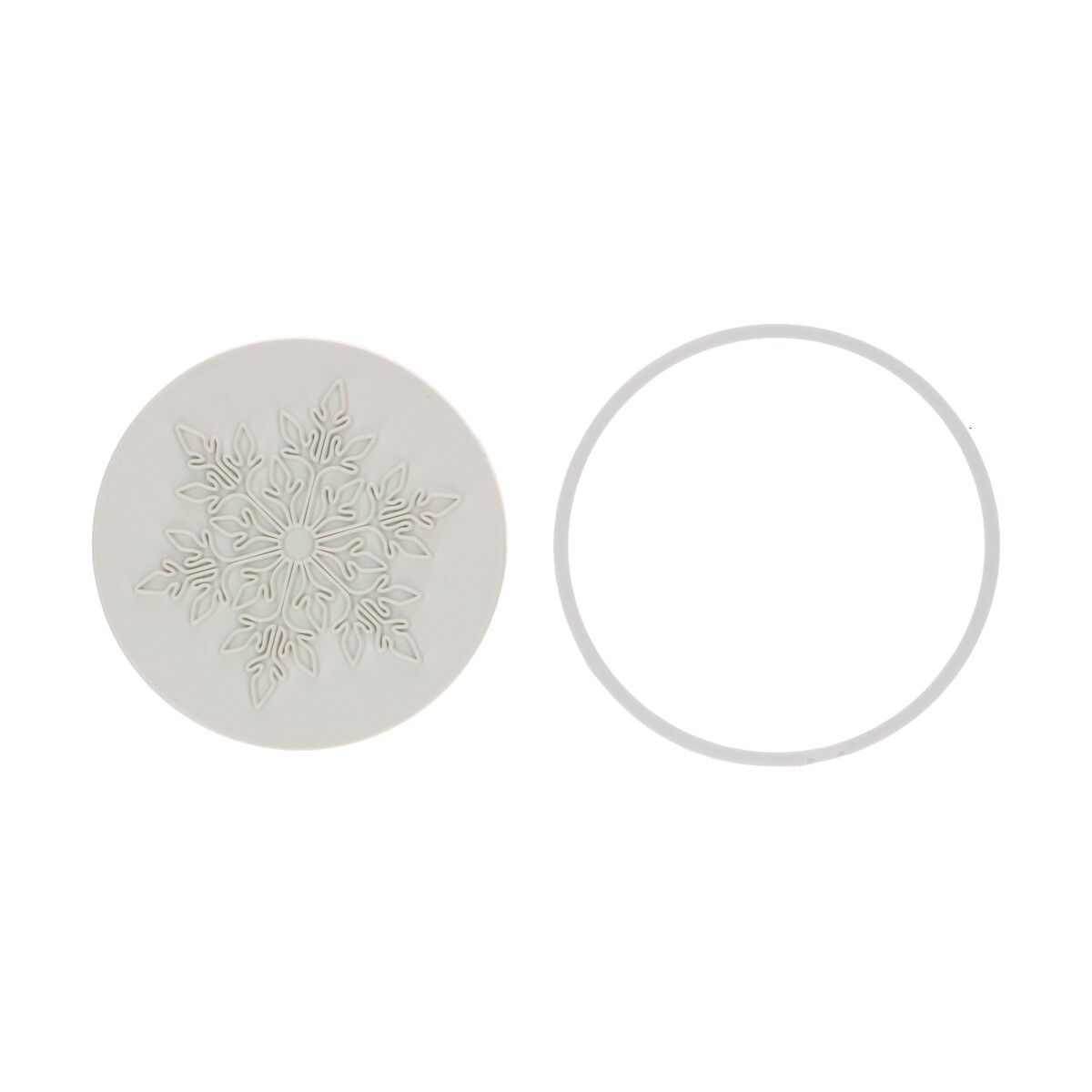 Okrągła foremka do wykrawania pierników, herbatników i innych ciasteczek, z pasującym do niej stemplem z wzorem śnieżynki. Można jej również użyć do wykrawania dekoracji z masy cukrowej i marcepana.