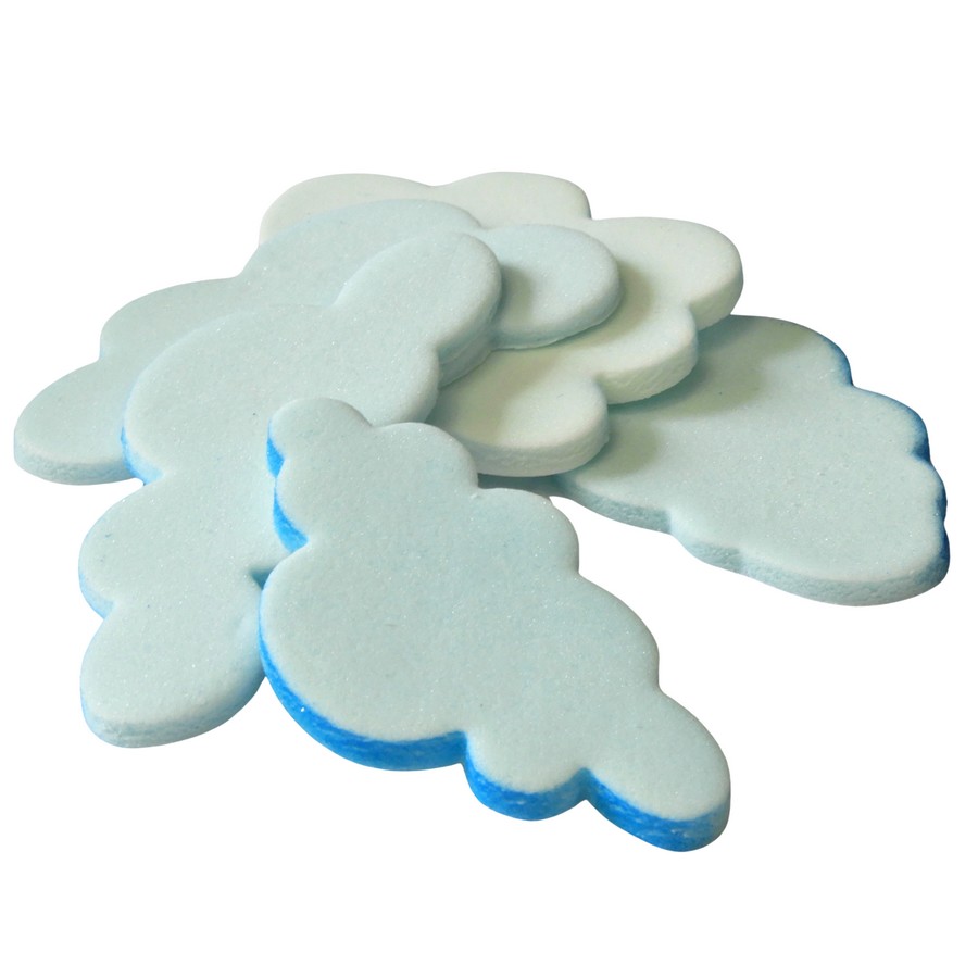 Ozdoby cukrowe w kształcie białych niebieskich chmurek, w różnych rozmiarach.