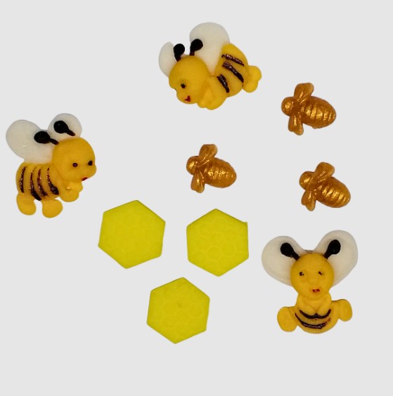 Ozdoby cukrowe w kształcie wesołych pszczółek i plastrów miodu.