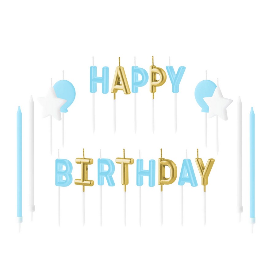 Zestaw świeczek urodzinowych w kolorystyce niebiesko złoto białej.