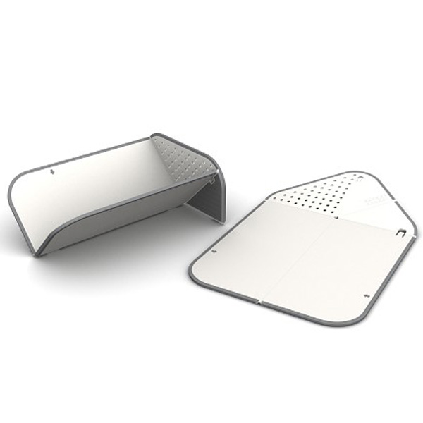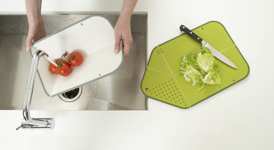 Deskę RINSE & CHOP można złożyć do wygodnego kształtu rynny, opłukać i odcedzić zawartość, a następnie wygodnie zsunąć pokrojone warzywa, mięso itp. do misy, garnka lub patelni.