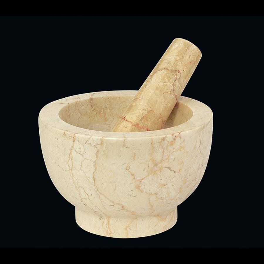 Tradycyjny moździerz z marmuru w kolorze kremowym. Z jego pomocą szybko rozdrobnisz i połączysz różne składniki.