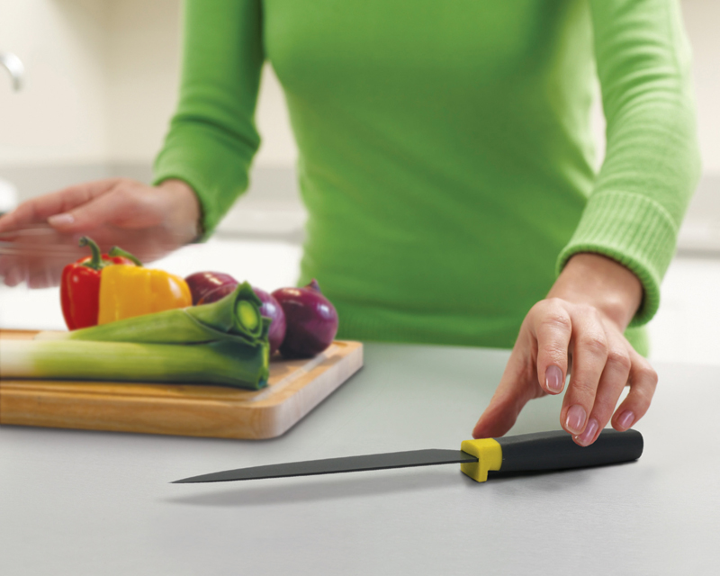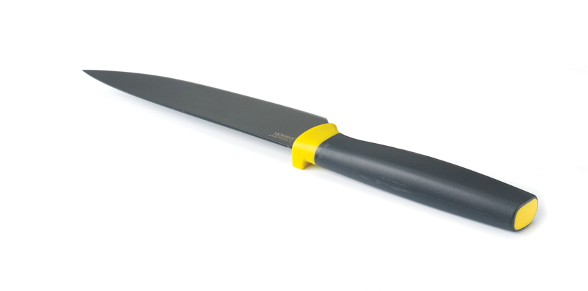 Podobnie jak inne narzędzia ELEVATE, nóż jest wyposażony w podpórkę utrzymującą brudne ostrze nad blatem kuchennym.