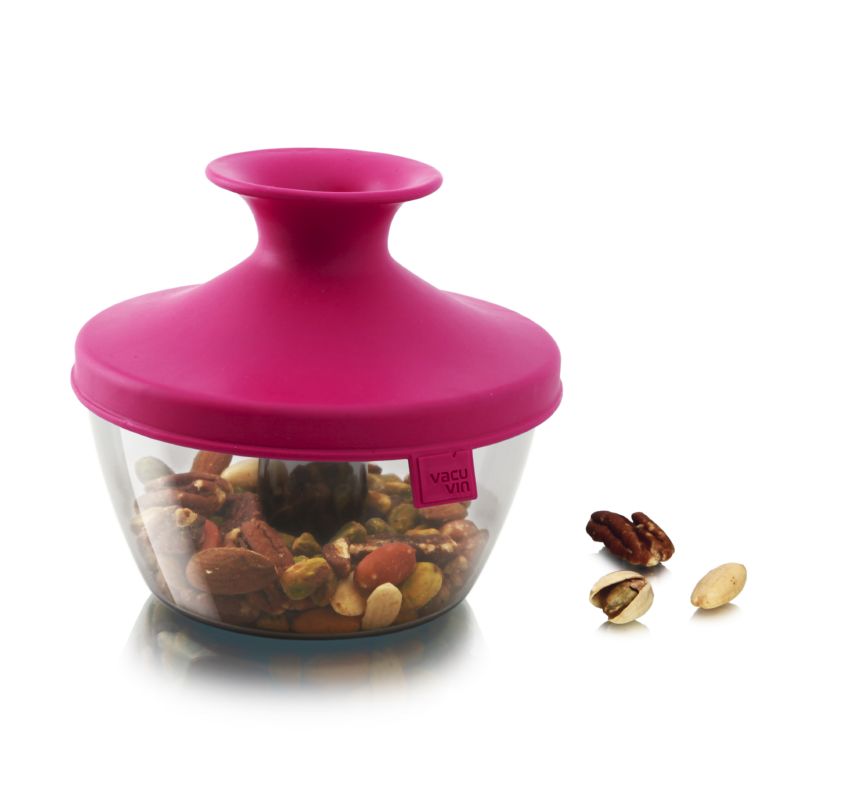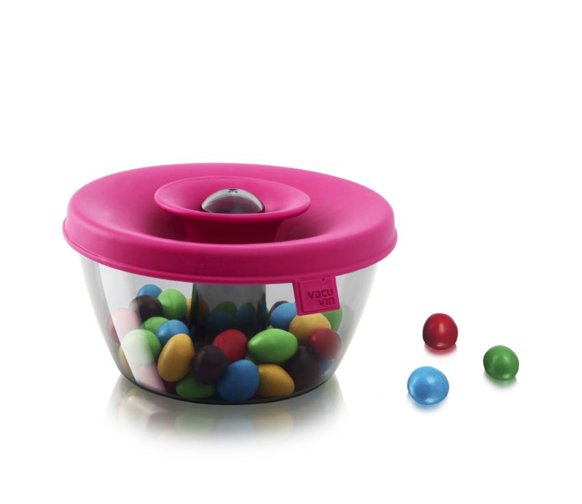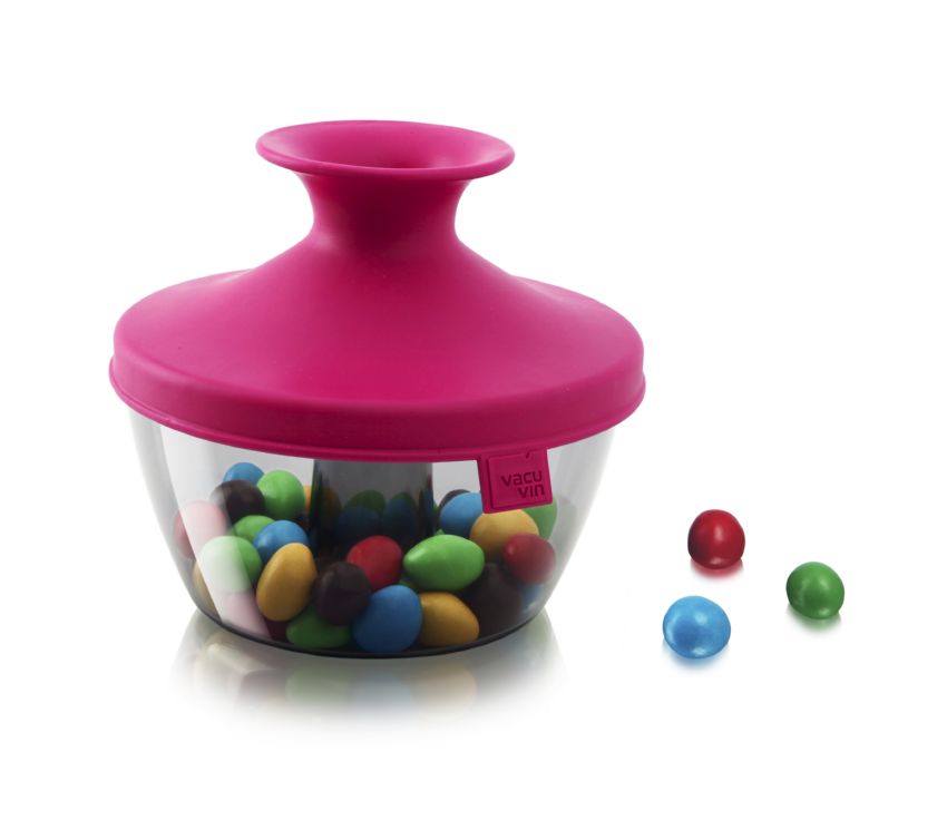 Pokrywka wykonana z gumy jest elastyczna, dzięki temu oraz opatentowanemu systemowi Oxiloc, w pozycji zamkniętej szczelnie zabezpiecza zawartość pojemnika. Pociągając za środkową część pokrywka otwiera się tworząc lejek, przez który łatwo dozować znajdujące się w środku cukierki lub orzechy. Aby zamknąć pokrywkę ponownie wystarczy jedynie nadusić lejek.