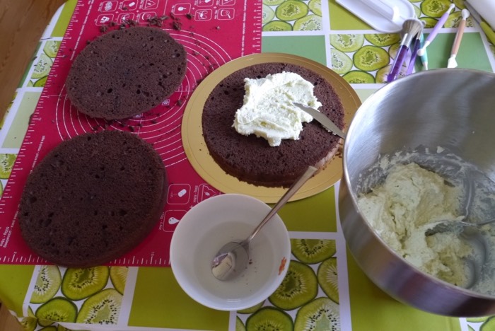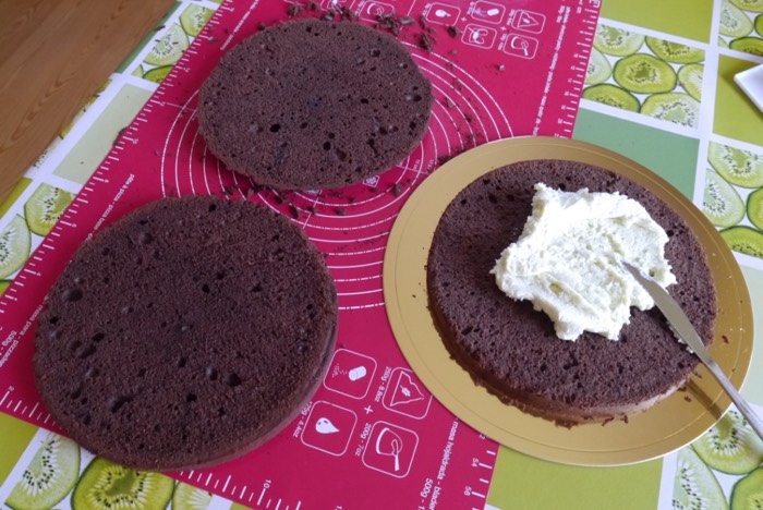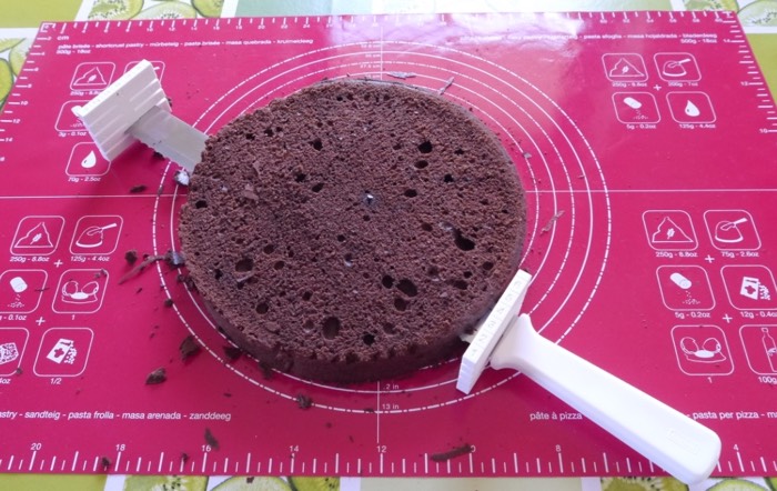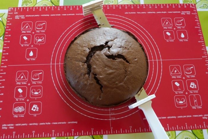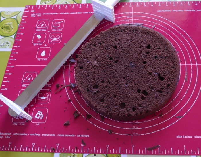 1. Pierwszy krok to podzielenie ciasta na blaty. Ja z reguły robię blaty grubości ok. 1,5 cm, najwygodniej mi się na takich pracuje, łatwo kontrolować poziom nasączenia i dobrze wyglądają po rozkrojeniu tortu. Do krojenia używam