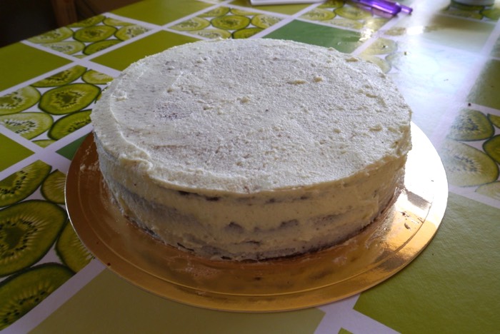 8. Cały tort pokrywamy szczelnie kremem. Do pokrycia tortu możemy użyć tego samego kremu, którym przekładaliśmy blaty lub innego - ważne jest, żeby był to krem na bazie masła. Może zawierać drobinki orzechów lub migdałów, to nie przeszkadza w późniejszej dekoracji. Warstwa kremu nie musi być gruba - ważne, żeby była szczelna.