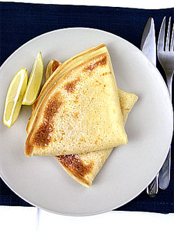 - Rozgrzej patelnię, wrzuć na nią kawałek masła (pół łyżeczki) i wlej porcję ciasta. Krążąc patelnią, rozprowadż je po całej powierzchni. Smaż około pół minuty, aż brzegi zaczną się wywijać. Odwróć na drugą stronę i smaż na złoty kolor. Przełóż na talerz i przykryj ściereczką na czas smażenia pozostałych naleśników. W razie potrzeby (jeśli naleśniki zaczynają przywierać) podczas smażenia następnych, na patelnię włóż kawałeczek masła przed wlaniem kolejnych porcji ciasta.