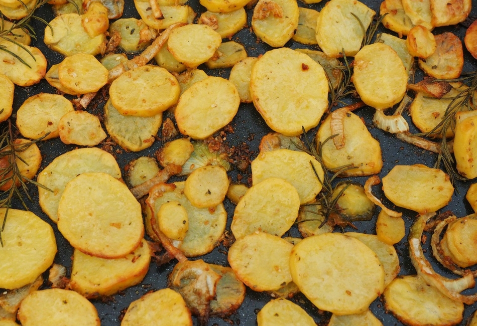 Ziemniaki kroimy w cienkie talarki. Im cieniej pokroimy, tym bardziej będą przypominać chipsy i o to nam chodzi. Blachę wykładamy papierem do pieczenia, układamy talarki ziemniaków, spryskujemy oliwą, solimy pieprzymy i wkładamy do piekarnika nagrzanego do 200 stopni na pół godziny, aż będą rumiane i chrupiące.