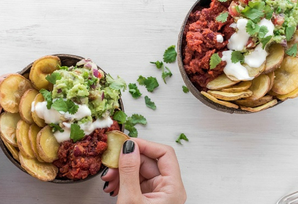 Układamy w miseczkach upieczone ziemniaczki, chili, guakamole i śmietanę. Posypujemy świeżą kolendrą. Danie gotowe.