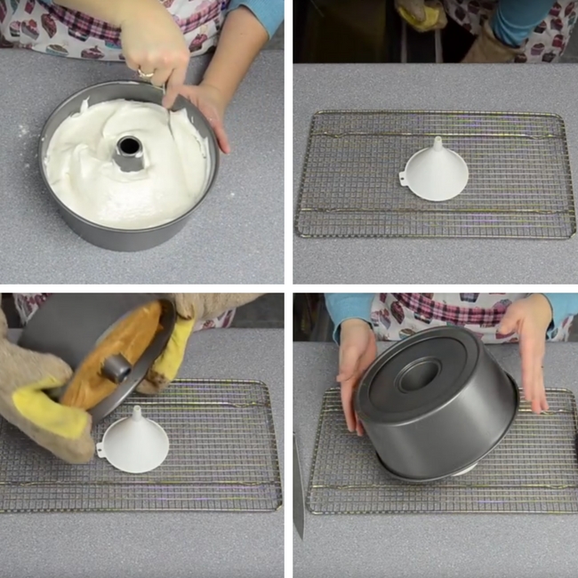 kratkę i na niej ustawiamy lejek. Blachę ustawiamy na lejku do góry nogami, nasadzając kominek na lejek i pozostawiamy do ostygnięcia. W ten sposób nasz Angel Food Cake, stygnąc nie opadnie i nie straci swojej puszystości. Jeśli mamy specjalną formę do pieczenia biszkoptu anielskiego, po prostu ustawiamy ją na nóżkach.