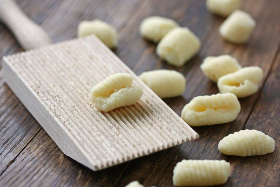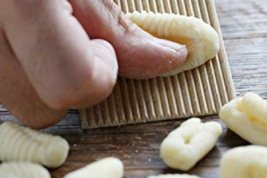 Jeśli chcemy mieć prawdziwe gnocchi, rolujemy kluseczki po grzbiecie widelca, opierając wiedelec na stolnicy wypukłą stroną do góry. A najlepiej jeśli zaopatrzymy się w specjalną, rowkowaną deseczkę i na niej rolujemy nasze kluseczki, jak to widać na zdjęciu.