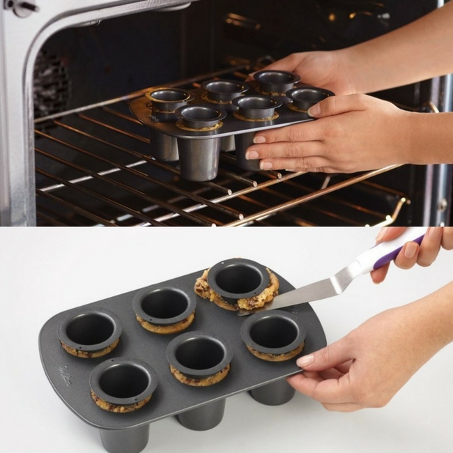 Z ciasta odrywamy porcyjki wielkości orzecha włoskiego i wylepiamy nim dno i ścianki każdego z sześciu wgłębień formy, dociskając ciasto wkładem. Wkłady zostawiamy w formie na czas pieczenia.
