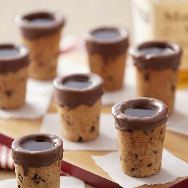Gdy ciasteczka zupełnie wystygną, Candy melts lub czekoladę rozpuszczamy w mikrofalówce lub kąpieli wodnej. Pokrywamy polewą wnętrza ciasteczek, zapełniając pędzelkiem wszelkie szparki i nierówności. Polewa czekoladowa ma uszczelnić kieliszki. Gdy polewa kompletnie zastygnie, nasze ciasteczkowe kieliszki są gotowe.