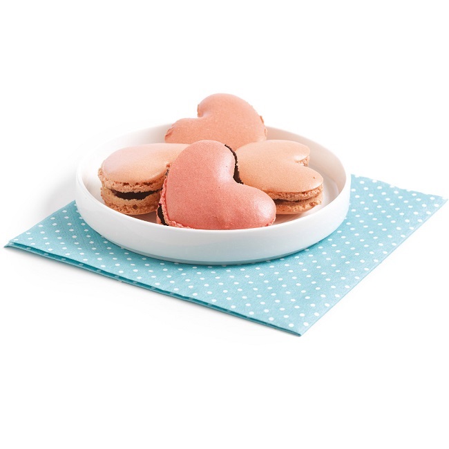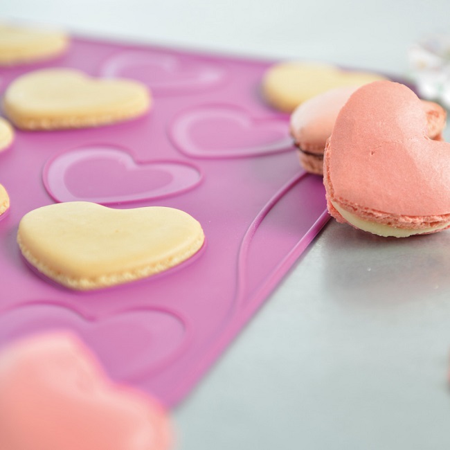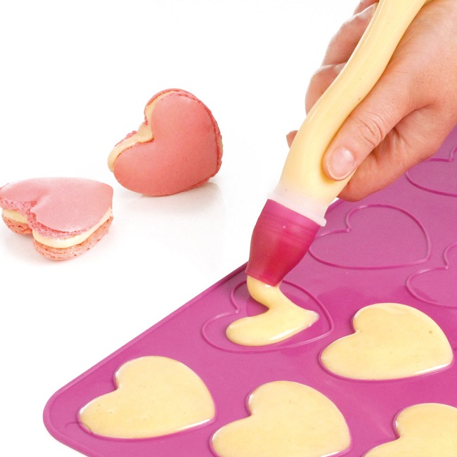 Przesiewamy mąkę migdałową z cukrem pudrem i dodajemy do białek. Mieszamy wszystko szpatułką, zagarniając masę ze ścianek miski i delikatnie przekładając, tak by nie powstawały pęcherzyki powietrza. Wykładamy matę do pieczenia makaroników na blachę. Masę makaronikową przekładamy do rękawa cukierniczego i wyciskamy ciasteczka w kształcie serduszek – zgodnie z wzorem na macie. Staramy się by masa nie dochodziła brzegów serduszka.