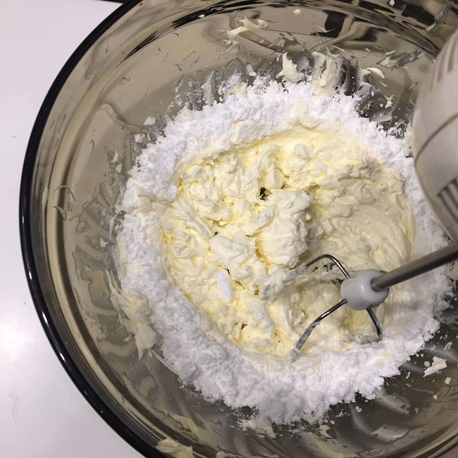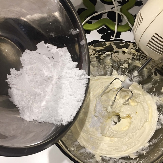 Gdy krem zrobi się jednolity, dosypujemy resztę cukru, wolno mieszamy i następnie miksujemy na gładki krem, pamiętając by od czasu do czasu zganiać szpatułką krem ze ścianek miski.