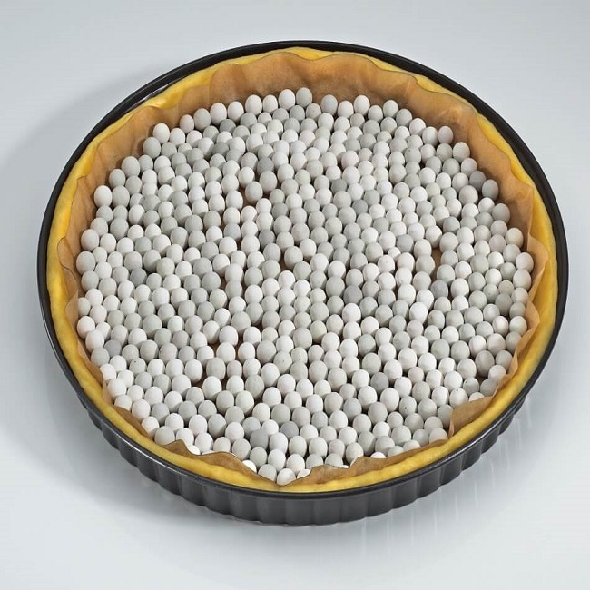 Rozwałkowujemy ciasto na cienki placek (3-4 mm). Ciastem wykładamy formę do tarty. Odcinamy nadmiar ciasta. Nakłuwamy ciasto widelcem, układamy papier do pieczenia i na wierzch wysypujemy obiciążające kuleczki ceramiczne.