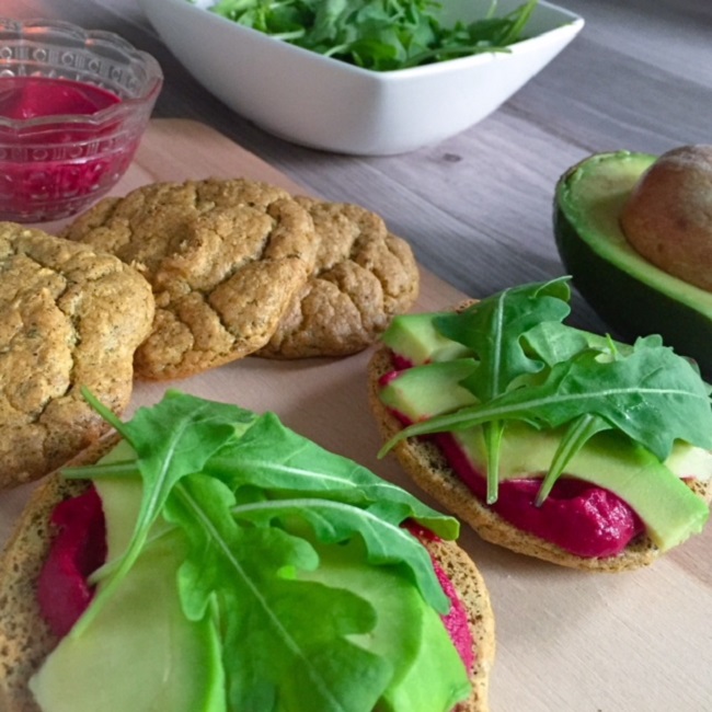 Buraka blendujemy z czosnkiem, octem, twarożkiem i przyprawami na gładką masę. Smarujemy tym płaską stronę naszych bułeczek. Układamy na tym kawałeczki awokado, na wierzch jeszcze po kilka listków rukoli.