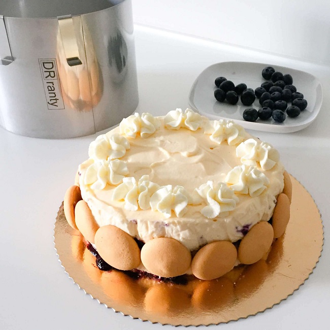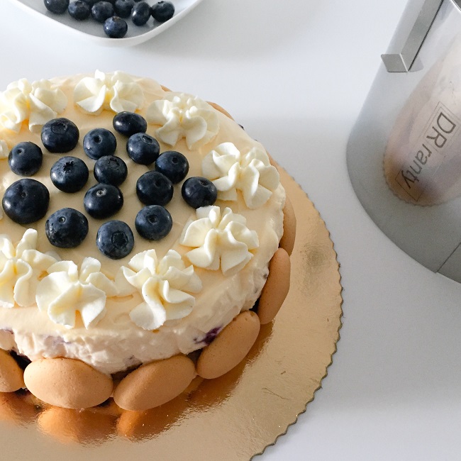 Boki deseru obłożyłam biszkoptami – dobrze trzymają się kremu. Wierzch udekorowałam bitą śmietaną i świeżymi borówkami. Trochę wygląda jak tort i nawet dobrze się kroi, ale do nałożenia porcji na talerz potrzebna jest łopatka – bo jak przystało na tiramisu, nasz deser ma nieco chwiejną strukturę.
