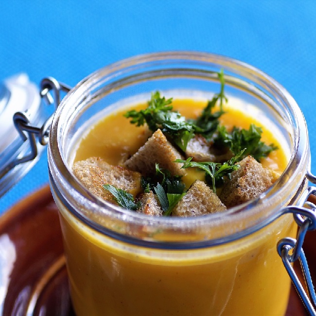 Kroimy cebulę i czosnek, podsmażamy na oliwie, aż się zeszklą. Dodajemy pokrojoną w kostki dynię i dalej smażymy przez parę minut. Zalewamy bulionem. Dorzucamy pokrojoną marchewkę i seler. Gotujemy wszystko do miękkości. Pod koniec gotowania wcieramy gałkę muszkatołową i dodajemy świeżo zmielony pieprz.