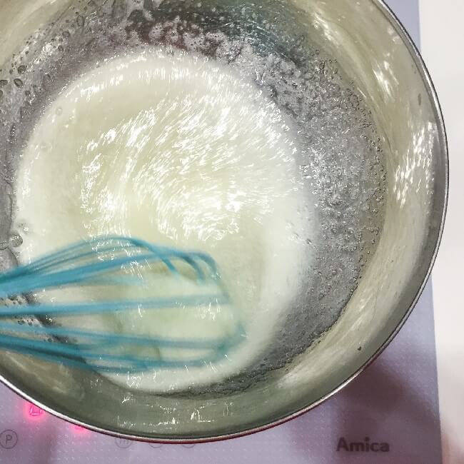 Białka przelewamy do metalowej miski, którą umieszczamy nad garnkiem z gotującą się wodą. Miska nie powinna stykać się z wodą, by zbyt szybko się nie nagrzewała. Wsypujemy cukier i trzepaczką intensywnie mieszamy, aż cały cukier się rozpuści. Trzeba sprawdzić organoleptycznie czy nie są wyczuwalne grudki. Jeśli nie czujemy nic pod palcami, białka są gotowe do dalszej obróbki.