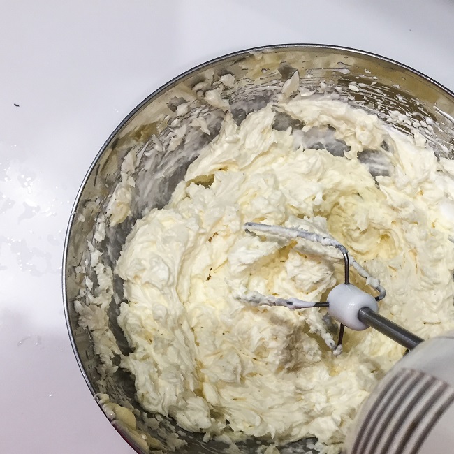 Teraz dodajemy masło. Po kawałeczku. Najlepiej pokroić na 10 – 12 kawałków i dodawać po jednym, a po dodaniu kontynuować miksowanie, aż całe masło się w miesza. To też jest moment na dodanie pasty z waniilli.