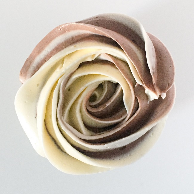2D. Cupcake Jemma ma ciekawy sposób. Wykłada dwa kolory, warstwa jedna na drugiej na folię spożywczą, zawija, obcina jedną końcówkę i wkłada do rękawa obciętą końcówką w stronę tylki. Taki sposób pozwala bardziej równomiernie rozłożyć kolory, ale w naszym przypadku nierównomierność jest również apetyczna.