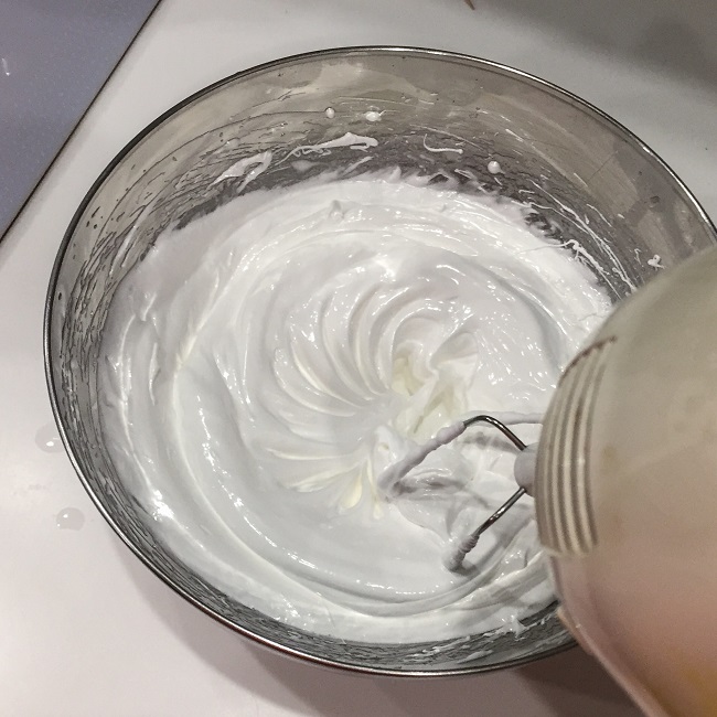 Zestawiamy miskę z garnka z wodą i mikserem ubijamy na sztywną pianę. Niektóre źródła podają, że ma to być 7 minut. I faktycznie po 7 minutach piana robi się gładka, jedwabista i sztywna w taki sposób, że wyciągana trzepaczka pozostawia szpiczaste stożki z piany. Nasza szwajcarska beza jest gotowa.