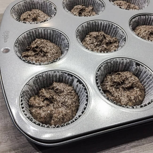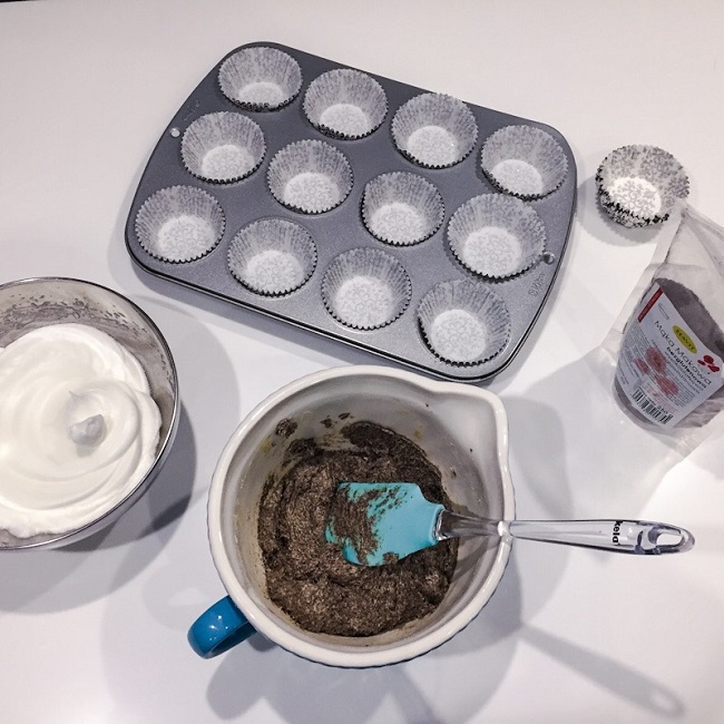 Formę metalową do muffinów wykładamy papilotkami i następnie każdą wypełniamy ciastem do połowy.