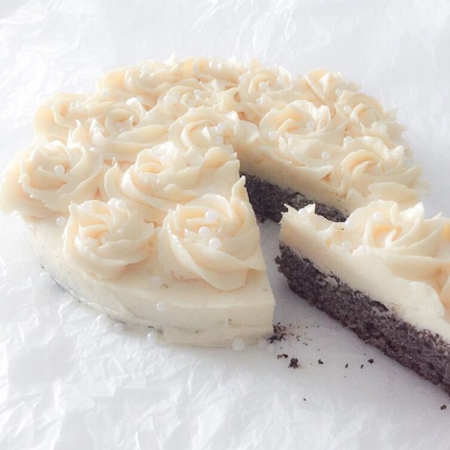 Po pół godzinie pozostałość kremu jeszcze raz miksujemy i przekładamy do rękawa z tylką 1M lub 2D. Ja użyłam 1M. Na schłodzonym torciku wyciskamy róże rozetkowe.