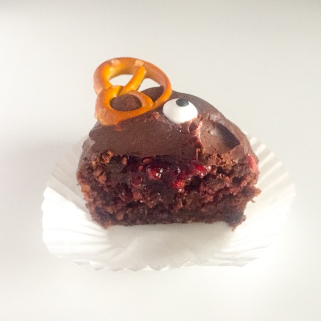 Najpierw w każdej drążymy niewielki otwór o średnicy około 2 cm i nie głębiej niż 2/3 wysokości muffinki – ja to zrobiłam nożem o cienkim ostrzu. Następnie używając worka cukierniczego wypełniamy każdy otwór konfiturą malinową.